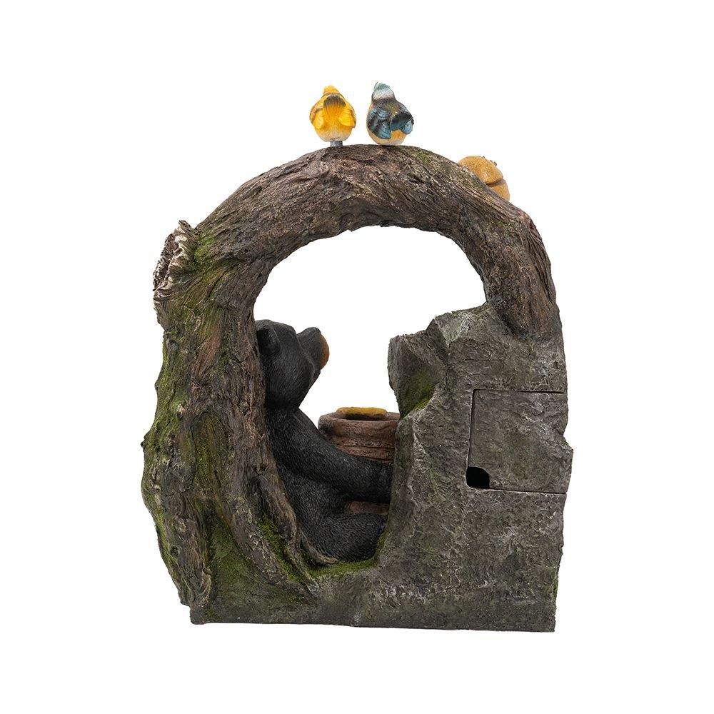 Crafted from durable, weather-resistant polyresin, this decorative fountain marries artistic intrigue with woodland whimsy. A mossy gray basin connects to a wood-inspired arch, creating a playful scene where perched birds, bees, and a cozy bear come together to enjoy the soothing flow of water.