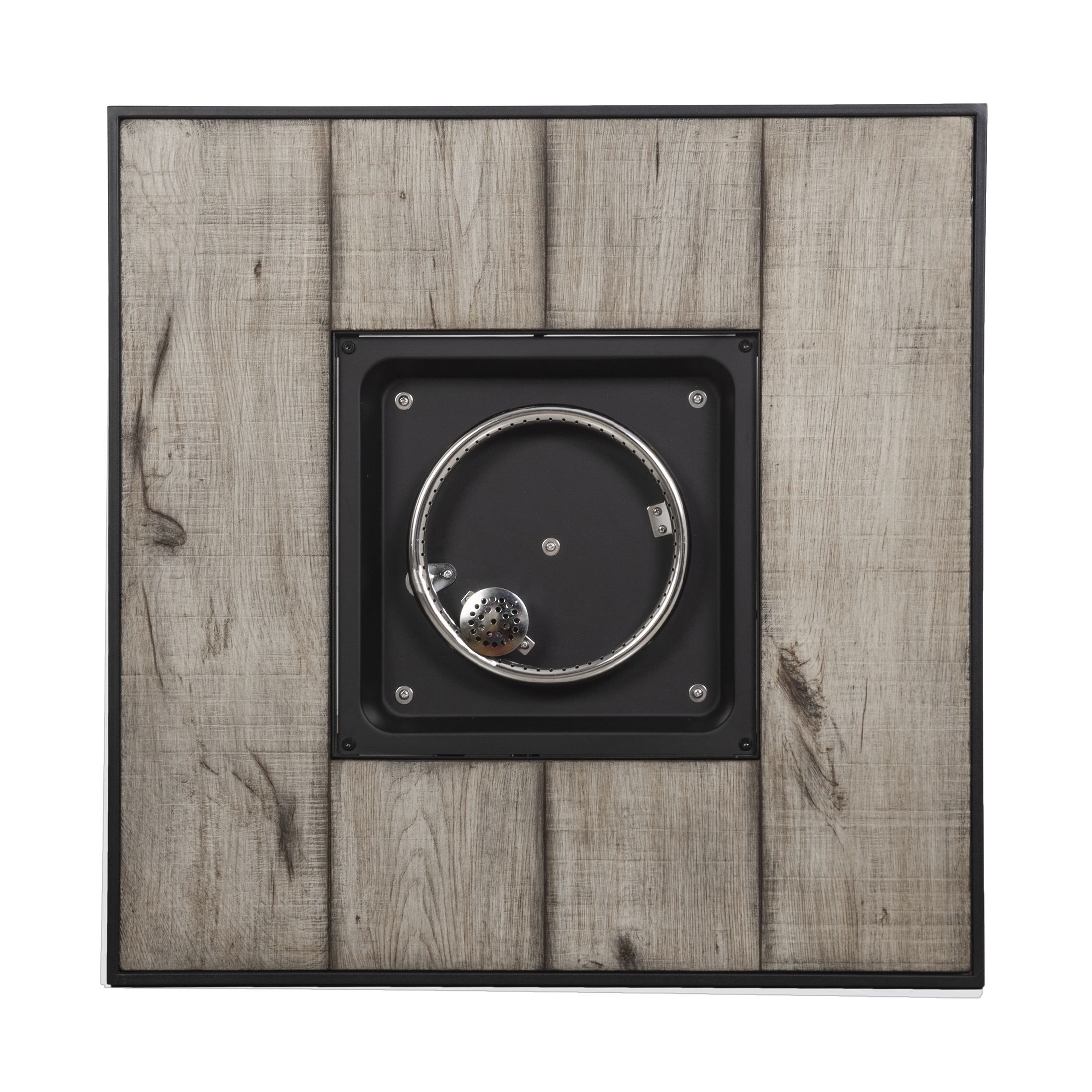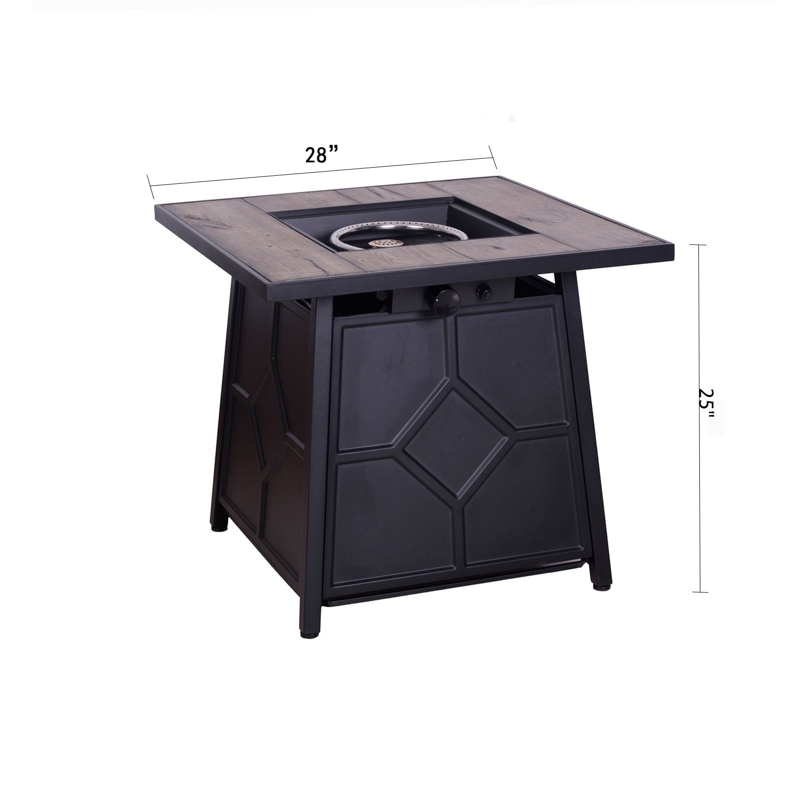 28 Inch Fire TableThe table top is mainly made of TerraFab, the base is metal. Its size is 28x28x25 inch. 40, 000 BTU fire pit is durable. This fire table ensures CAS-approved safety, enhanced quality, and improved performance for your everyday use. Each piece of the fire table is strictly tested before leaving the factory. It is easy to operate with the push-start ignition and adjustable flame option. With a simple push at the pulse switch and a turn at the valve knob, the electronic ignition system can start a beautiful fire in no time. When the flame dances on the lava rocks, it is an excellent patio fire pit table to keep you warm and intoxicated; close the fire lid and surround the woodgrain table top, and it is a coffee table. The included fire pit cover can also bring the best protection to this fire table.