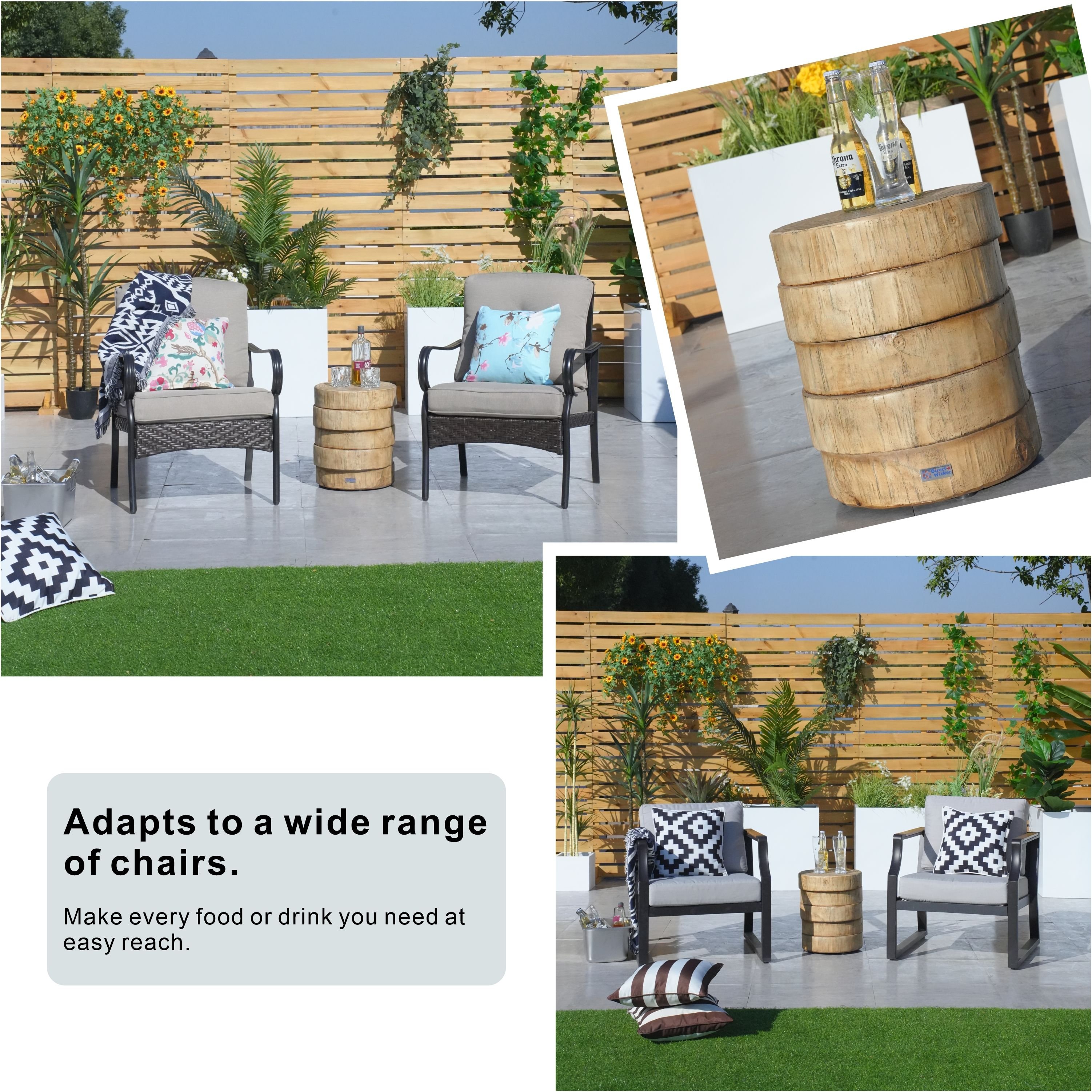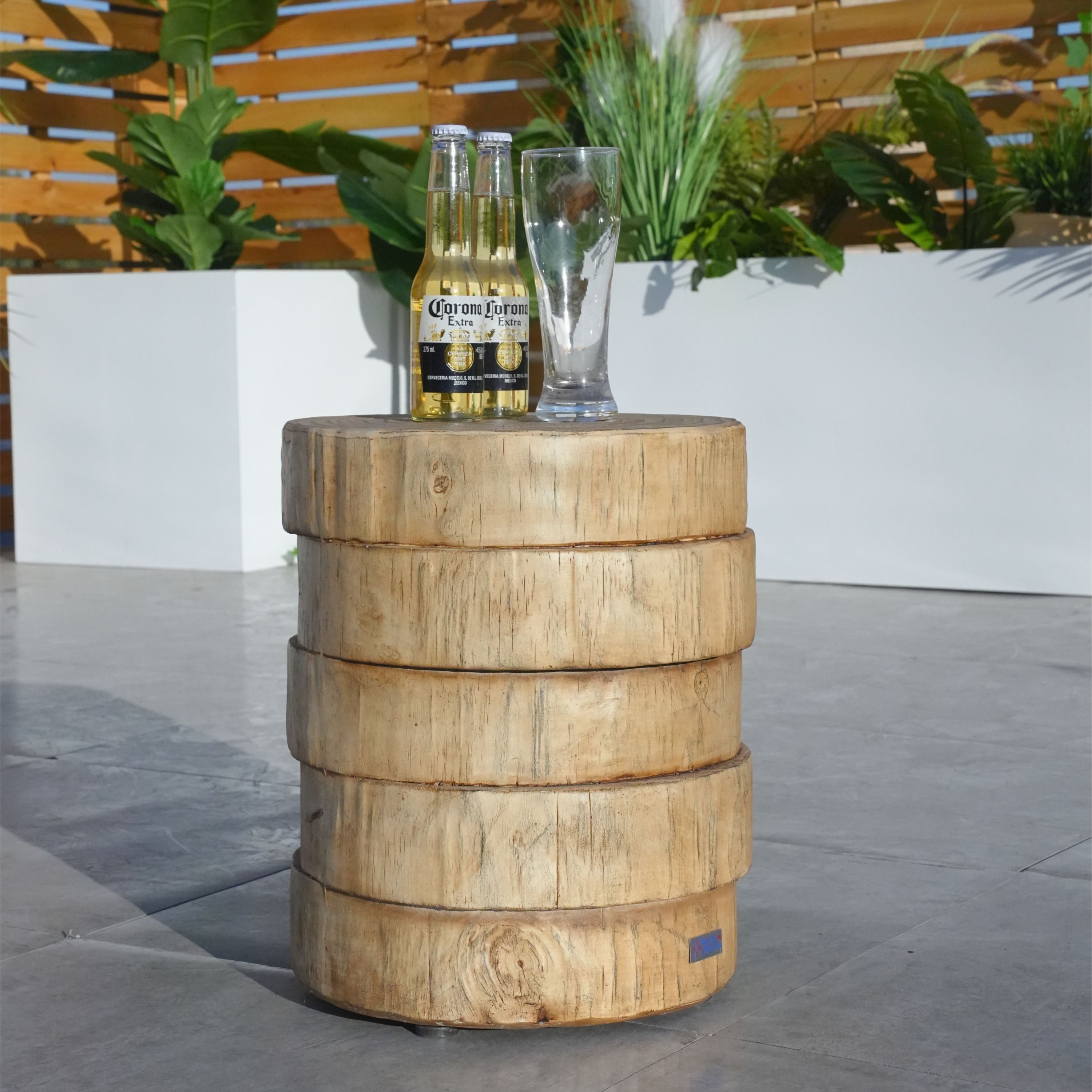 Enhance your living spaces with this stylish faux wood grain side table, designed to blend seamlessly with both indoor and outdoor settings. Made from durable Terrafab composite material, this side table features a natural wood color and texture, adding a touch of rustic charm to any environment. Measuring φ14.6' x 17'H, it provides a sturdy and attractive surface for drinks, decor, or plants, making it an ideal addition to your home or garden.