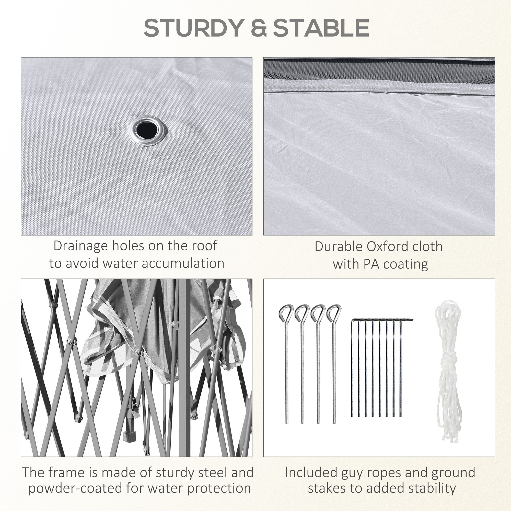 Pop-Up Fast and Easy Setup: This portable gazebo can be set up in a cinch; simply unfold the frame, cover it with the canopy, select the best of three heights, mount it to the ground, and you're ready to go. Complete with a carrying bag so you can bring it anywhere, transport and tear down are just as easy set-up.