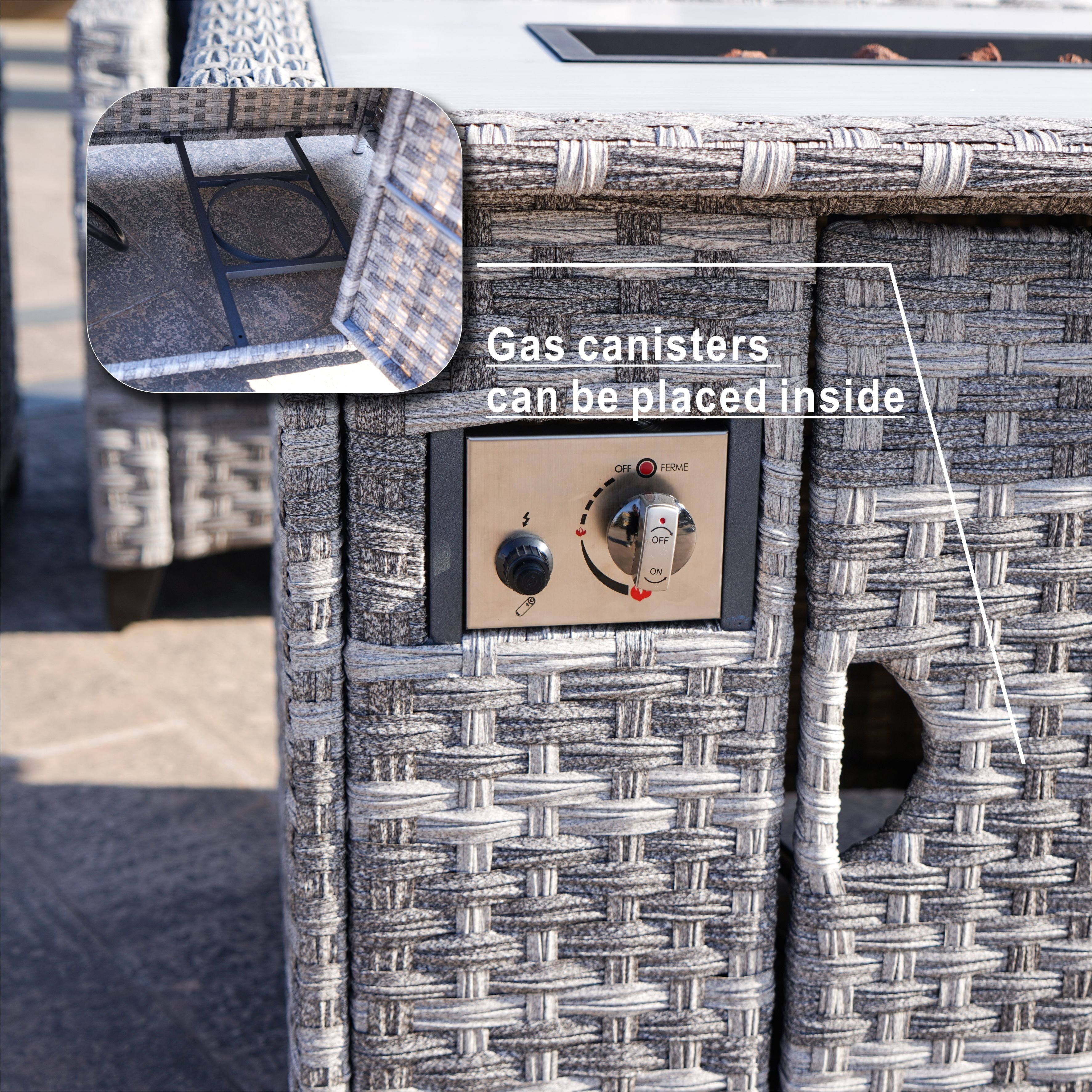 The table has a heat adjustable stainless steel gas fire-pit.