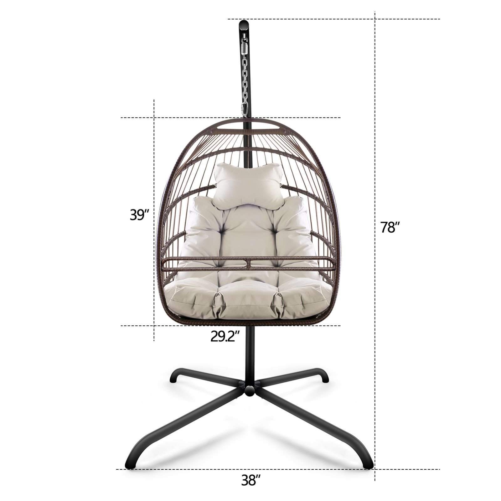 [PORTABLE DESIGN & FOLDABLE BASKET]This Hanging Chair with Stand All-in-one Seat, Back and Arm cushion also features Zippers to Easily Remove the Inner Cushions for Cleaning; The whole frame is made of Powder coated metal,and the frame and seat surface of the Egg Chair are made of rattan resin wickers wound around.As 2.75mm thicken steel pipes hold up the swing seat,it's safe enough to accommodate an adult to swing.Safety strap helps keep the chair safely in place while getting in and out of the chair.