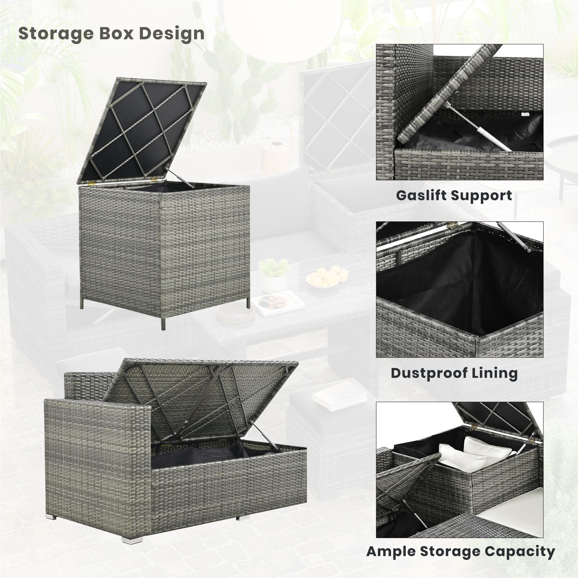 [Excellent Storage Capacity]This patio rattan sofa set has a number of storage options that make it a great choice for outdoor use.The loveseat sofa features an openable seat that provides ample storage space for cushions and other items, keeping them out of sight and protected from the elements.In addition to the seating options, the set also includes a gas lift storage box that provides even more storage space for outdoor essentials and is perfect for storing larger items.